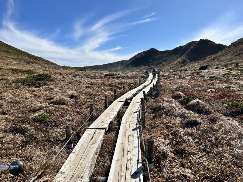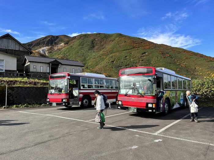 秋田県側の八合目登山口に行くバス乗り場である「アルパこまくさ」の駐車場に着いたら、県外ナンバーの車もたくさん停まってた。