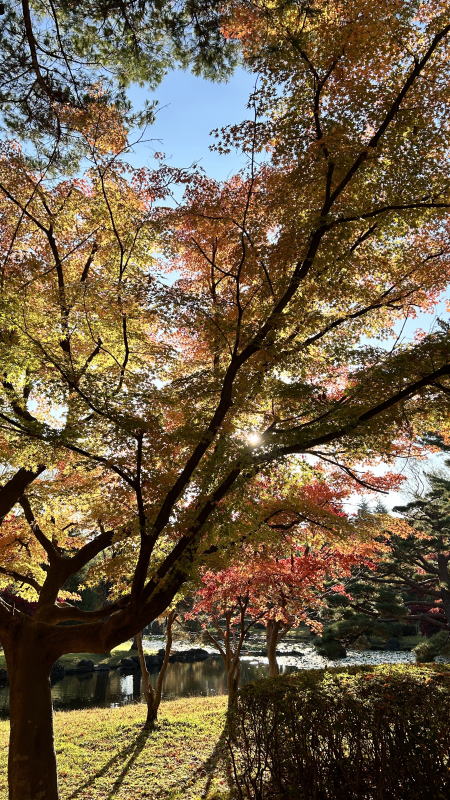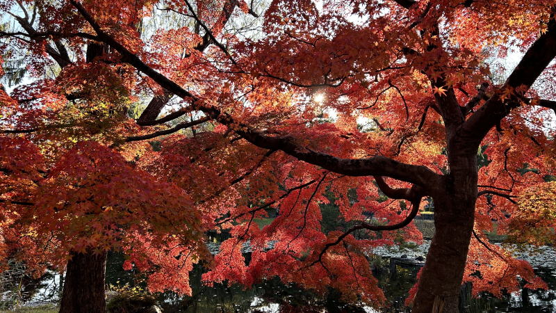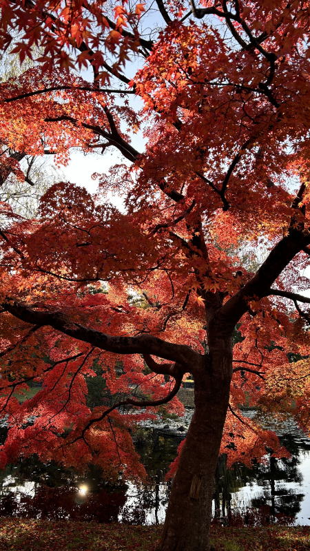 池の裏側に回り込むと、モミジが逆光になり 、これはこれで素晴らしい。(^^)