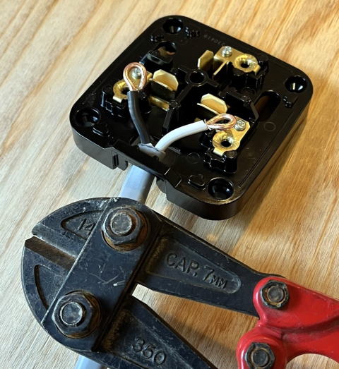 事前に情報収集して分かっていたが、芯線が太くて固いので扱いにくい。 特に露出コンセントへの結線に使う「輪作り」に難儀しそうだったので、練習してから行った。 練習してて良かった。けっこう難しい。