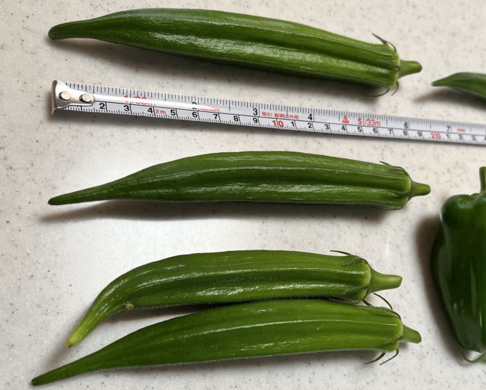 苗の説明札には、10cm以内で収穫と書いてあるが、オクラは葉っぱが大きいこともあって、実がついているのを発見しにくく、気がついたときはデカくなりすぎ・・・ということが、これまでも多々あった。