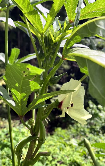 昨年初めて植えて気がついたのだが、オクラは暑いところの原産らしく気温が低いと全然成長せず、暑くなる7月末頃から人が変わったように(?)どんどん伸びる。