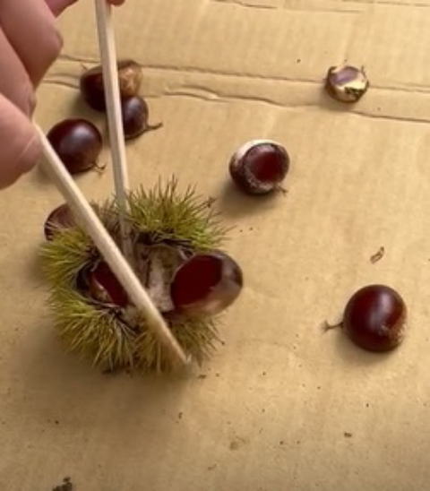 家のウッドデッキにダンボールを敷き、イガから 栗の実を取り出す。 割り箸を使ってホジホジすると・・